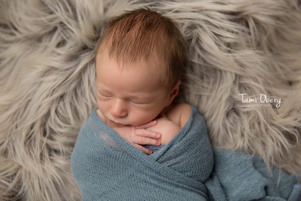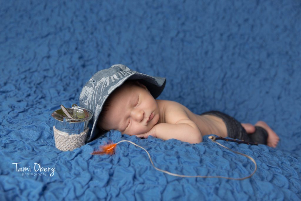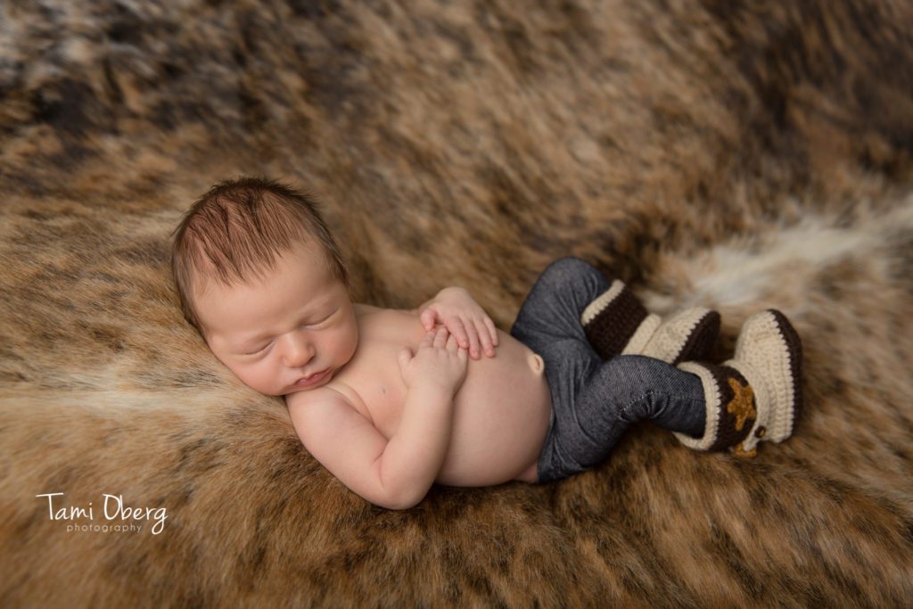 We had fun planning this newborn session for this darling little cowboy. Normally, I provide all the props for newborn pictures but this guy came with a few of his own. He brought his grandma’s beautiful cowhides and he looked so cute in a pair of my tiny newborn jeans and his knit cowboy boots. Since his parents love fishing, we had to take a picture with my little fishing pole too! He was nice and sleepy when he arrived, so we started with some poses on my beanbag with the hides and a blue backdrop and then we finished his session with some wrapped shots in fur and in a few props. Here are a few of my favorite images from Jace’s newborn session: