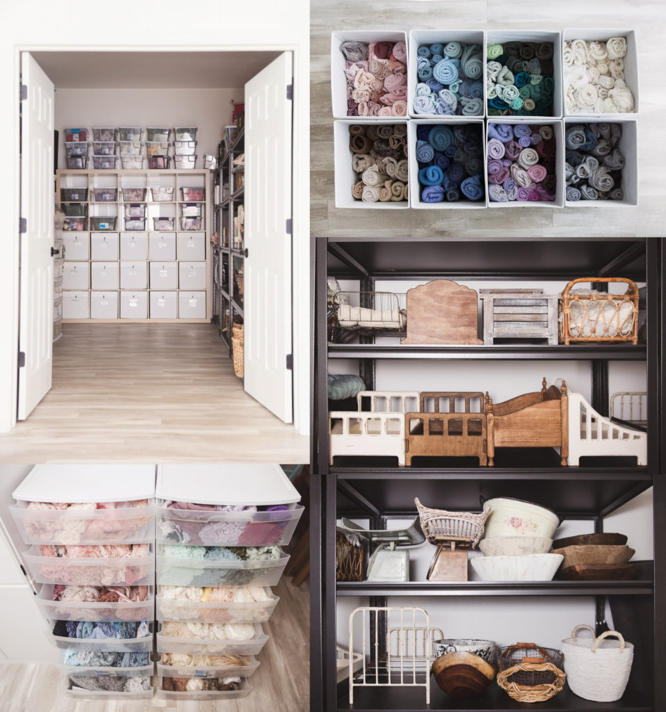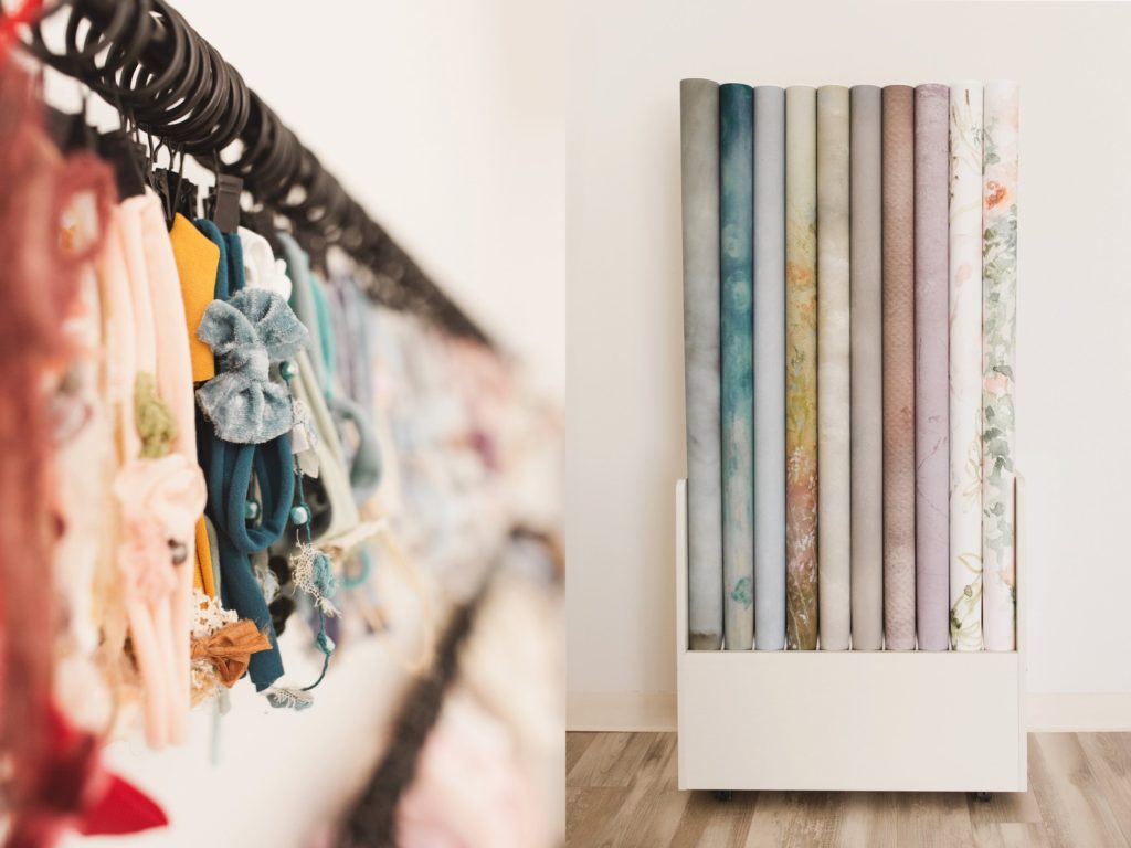 My prop closet is definitely my favorite part of my studio. I love having everything in one place. This is where I keep all my buckets, beds, baskets and bowls. I am a little obsessed with baby wraps and soft layers and have them organized by color to make it easy to color coordinate my sessions. Having my headbands, hats, wraps and other props organized by color makes them easy to find and plan a cohesive gallery for my clients. I look forward to all the babies and families I will photograph in this space!