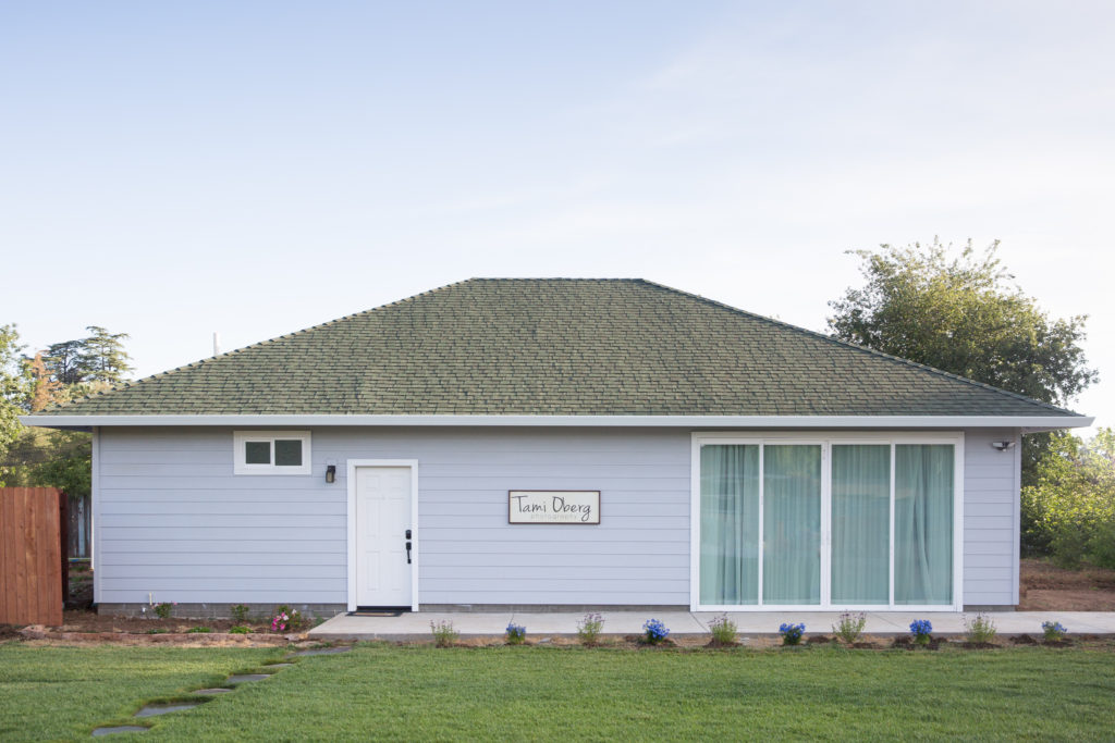 I am so excited to share some pictures of my new photography studio in Chico, California. I have been dreaming about this building for the past five years and I love being able to photograph newborns and babies in my new space. My neighbor, Ralph Auer, of Auer Construction did an amazing job making this dream of mine come to life. When I planned my studio I knew I wanted two things; a huge window for light and a huge closet for all my props and gear. My studio has a large, three panel sliding glass door to let in the light. I have sheers to filter in dreamy natural light and blackout curtains to use when I want dramatic studio lighting to show off newborn details. There is plenty of room for my clients to relax while I am taking pictures and most importantly…a huge walk-in closet for my props! I love having this much space to shoot. It allows me to have all my setups ready to go when babies arrive and eliminates transition time between shots. Below is a little peak inside my brand new space: